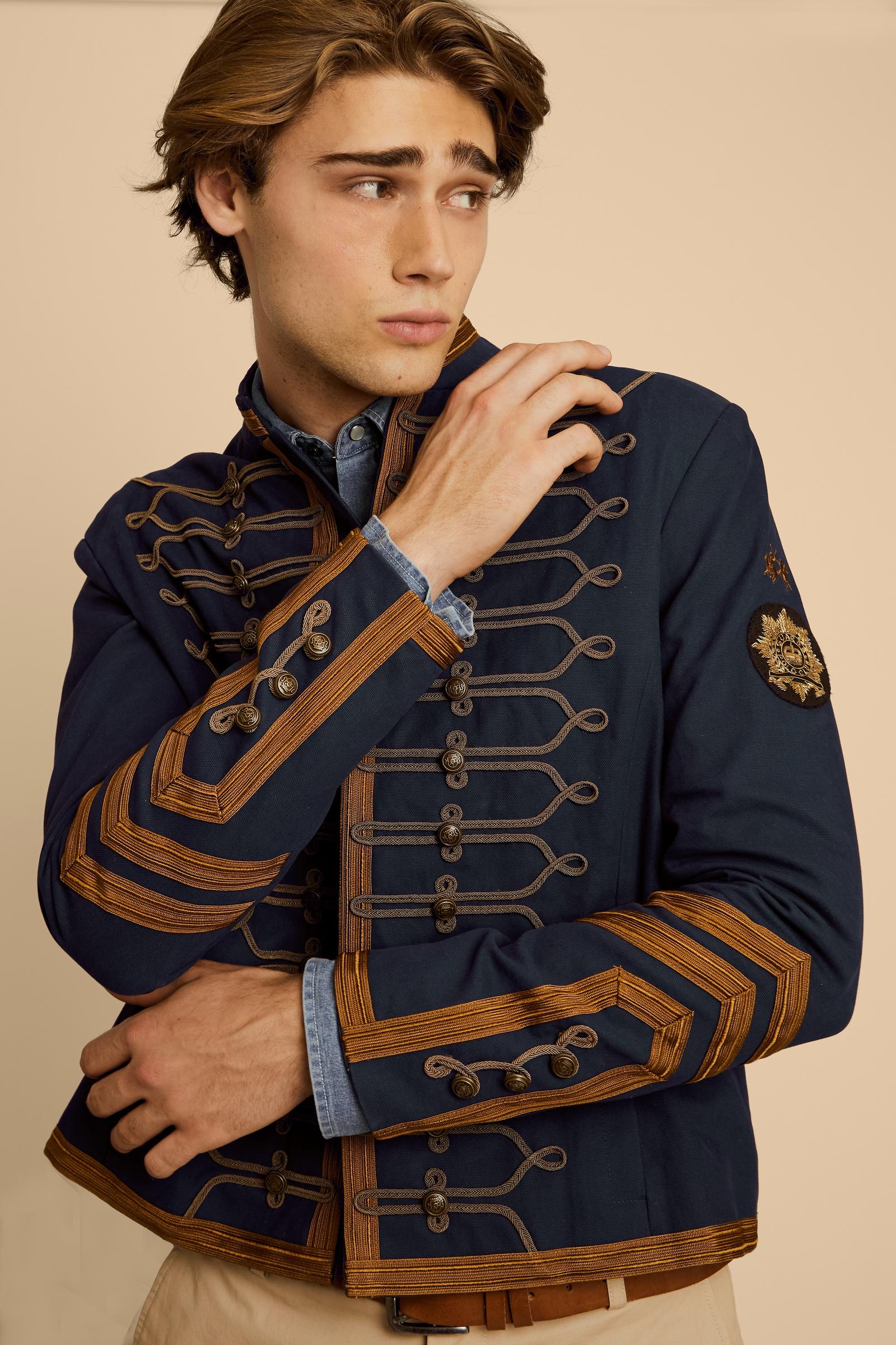 - Goldene Zierkordeln auf Vorderseite und Ärmeln, inspiriert von historischen Uniformen